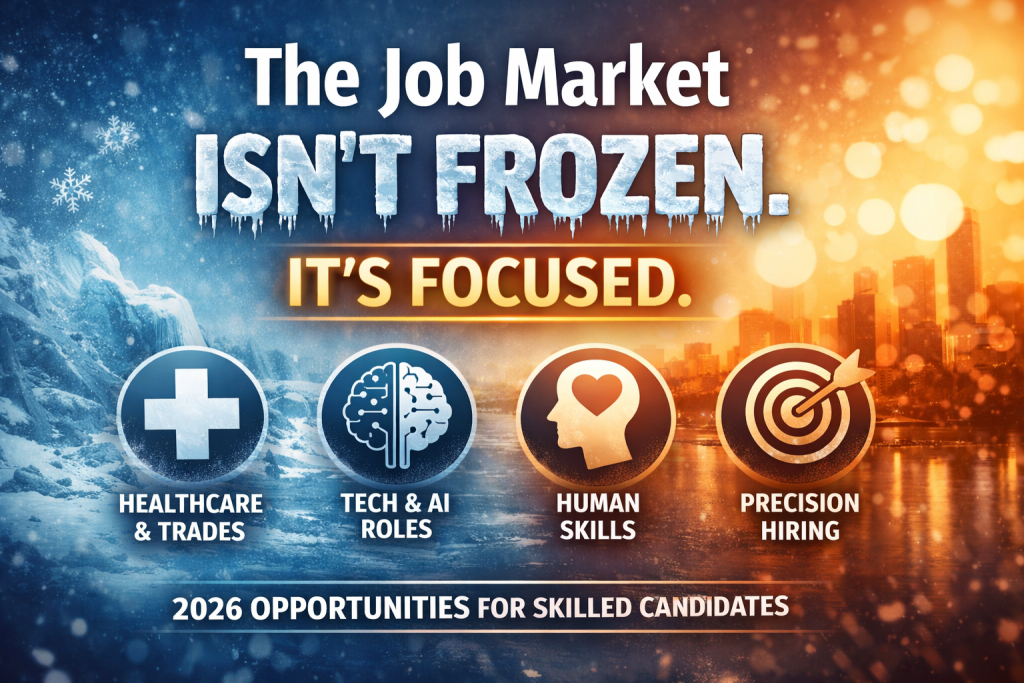 If you work in AI implementation, data, healthcare, cybersecurity, skilled trades, or human-centered leadership, the market is actively looking for you.